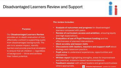 • Analysis of outcomes and progress for disadvantaged learners compared with peers.