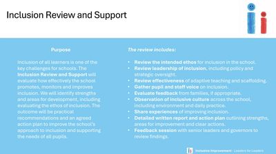 “The Inclusive Improvement team provided a thorough, insightful and evidence-led review of our school. Their depth of understanding and ability to balance professional challenge with practical, research-informed guidance was impressive. The feedback has directly supported our next steps in strengthening inclusion across the school. A highly professional and impactful partnership.
