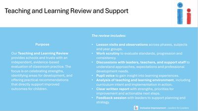 As a headteacher, I was impressed with the level of detail in the review. I am confident that the outcomes of this review will enhance the quality of teaching and learning across the school. The key development points identified will serve as a strong foundation to drive meaningful change and enhance the quality of teaching and learning across the school, making a tangible difference to the academic journey of children through our school.”